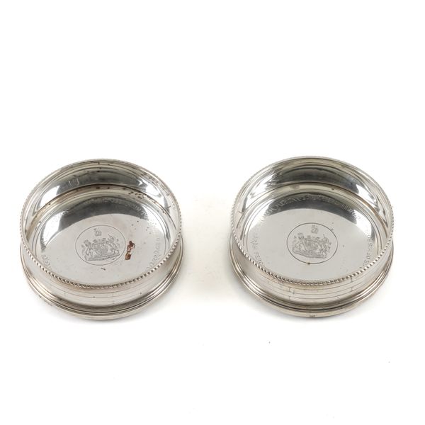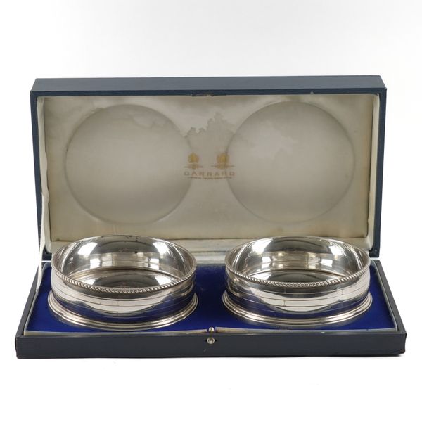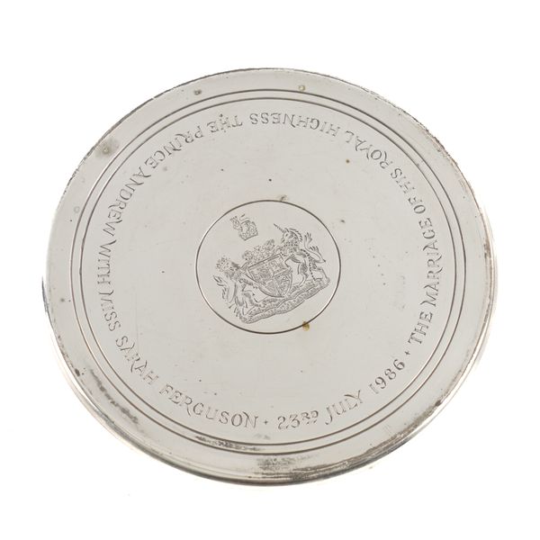 Each of circular form, with a cable form rim and detachable base, detailed 'The Marriage of His Royal Highness The Prince Andrew with Miss Sarah Ferguson 23rd July 1986 and having Royal Arms at the centre, by Garrard and Co Limited, London 1986, diameter 14cm, weight 577 grams, with green baize mounted bases, with a Garrard case