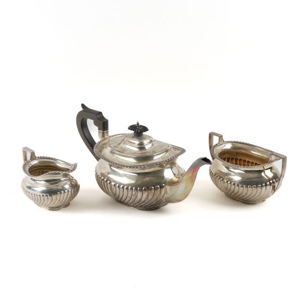 Comprising; a teapot with black fittings, a twin handled sugar bowl and a milk jug, each piece with curved fluted decoration and with a gadrooned rim, Sheffield 1912, combined gross weight 1070 grams
