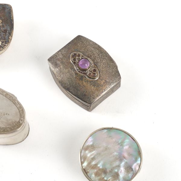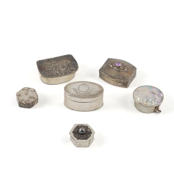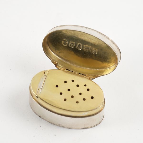 The oval vinaigrette with a plain pierced grille and with a box compartment to the underside, probably as converted from a nutmeg grater, the exterior with engraved decoration, London 1795, maker Thomas Phipps & Edward Robinson, length 41mm, weight 32 grams, a silver hexagonal small pill box and four further foreign boxes