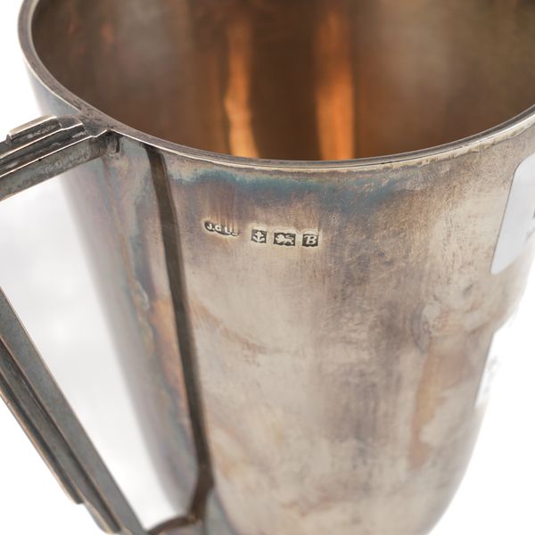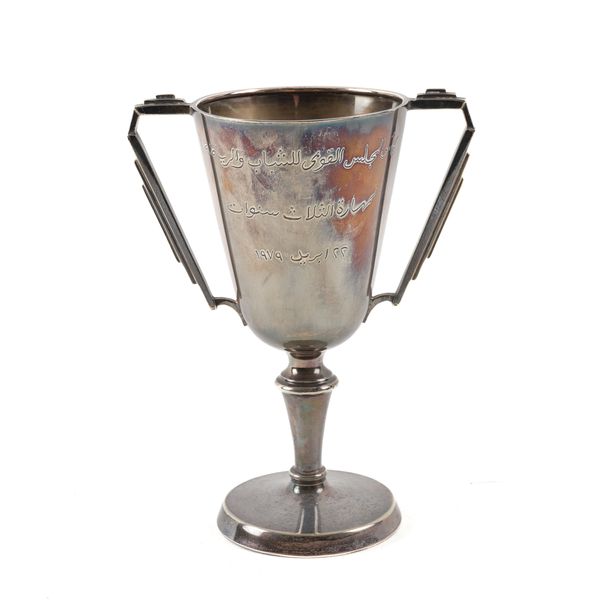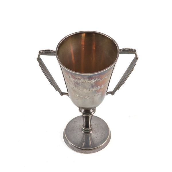 The handles of angular form in the Art Deco style, the body engraved with Arabic script, raised on a circular foot, height 17.6cm, Birmingham 1951, weight 253 grams