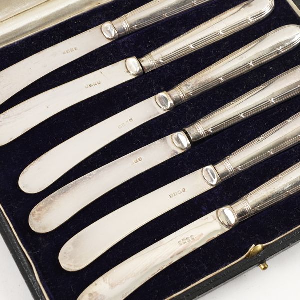 Comprising; a square cigarette box, wooden lined within, a mustard ladle, probably London 1810, two lidded glass toilet jars, Birmingham 1920, an Asian salt, a set of six plated tea knives, with a case and five items of plated flatware