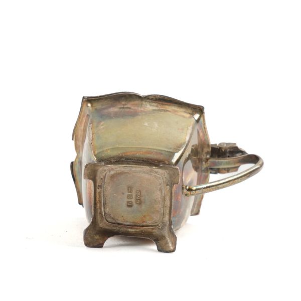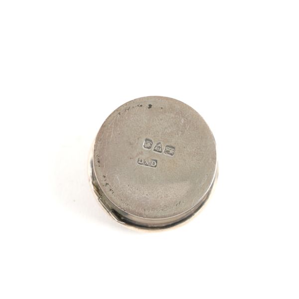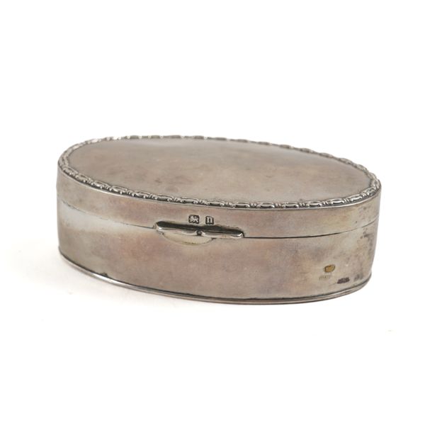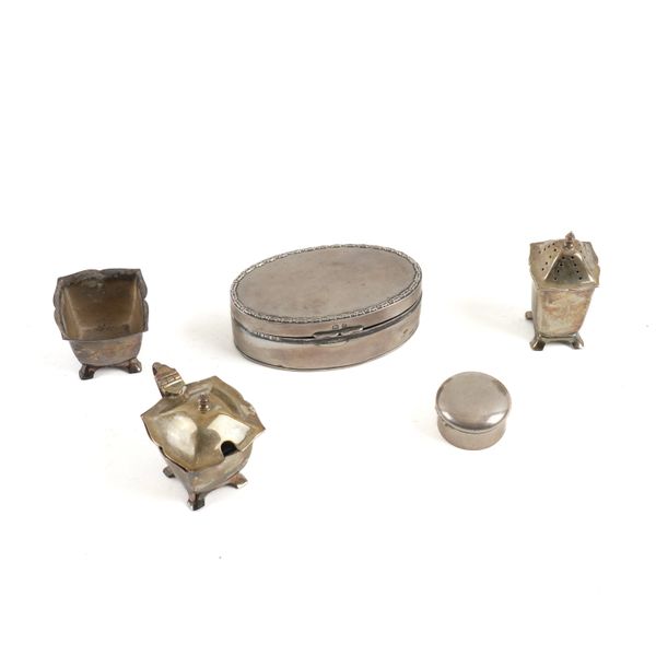Comprising; a hinge lidded oval trinket box, Birmingham 1912, a three piece condiment set, comprising; a mustard pot with a blue glass liner, a pepperette and a salt (the liner lacking), London 1966, also a hinge lidded pill box, Chester 1901, combined weight 147 grams