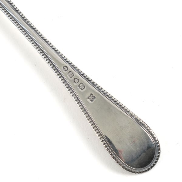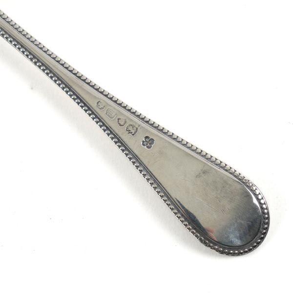 Bead edged Old English pattern, comprising; a dessert spoon and fork, London 1867, combined weight 101 grams and a knife, having a loaded handle, Sheffield 1867, with a later fitted case