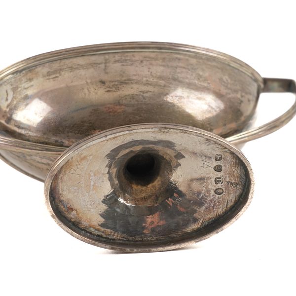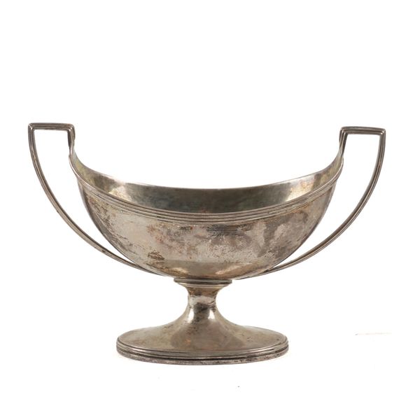 Each of boat shaped form, decorated with reeded rims, raised on an oval foot, London 1799,maker John Eames, monogram engraved, sample width 14cm, combined weight 208 grams
