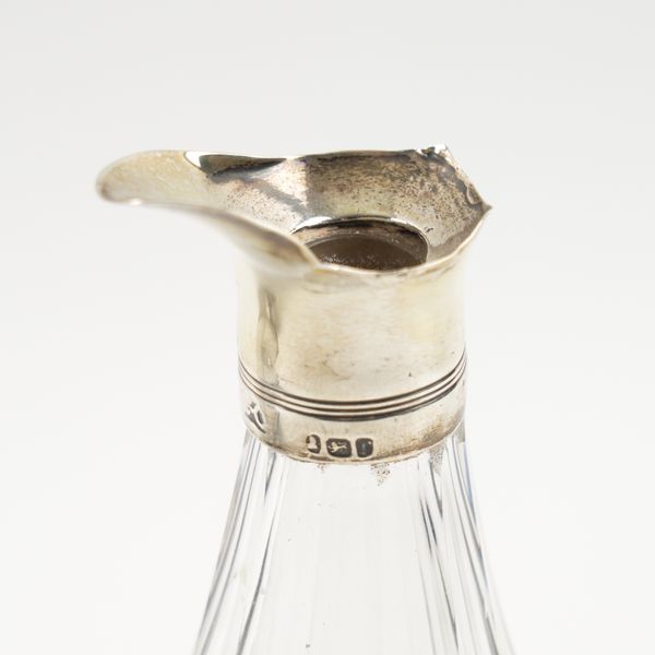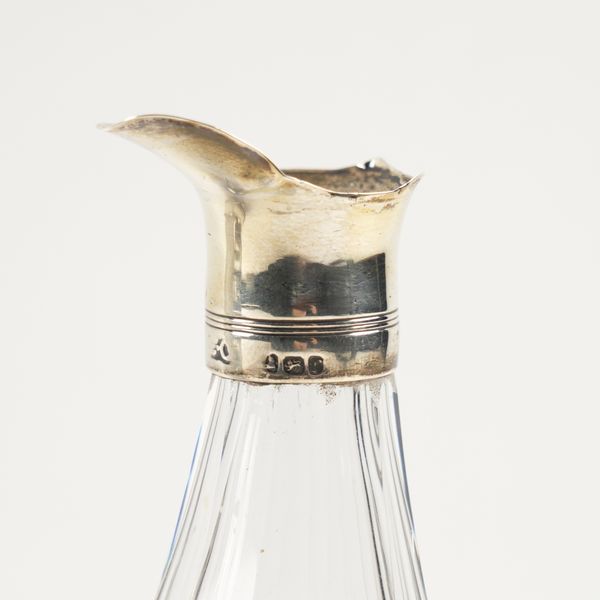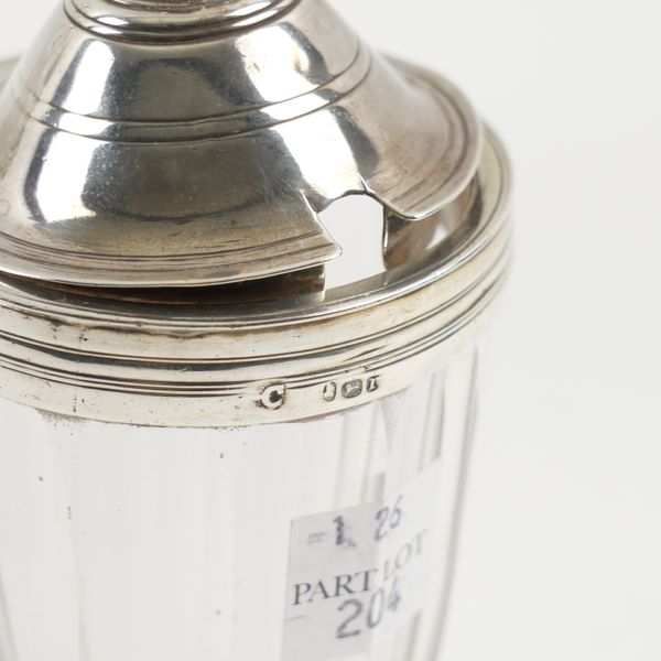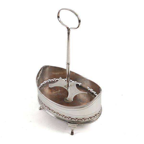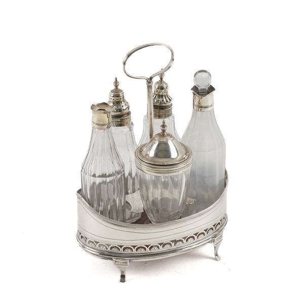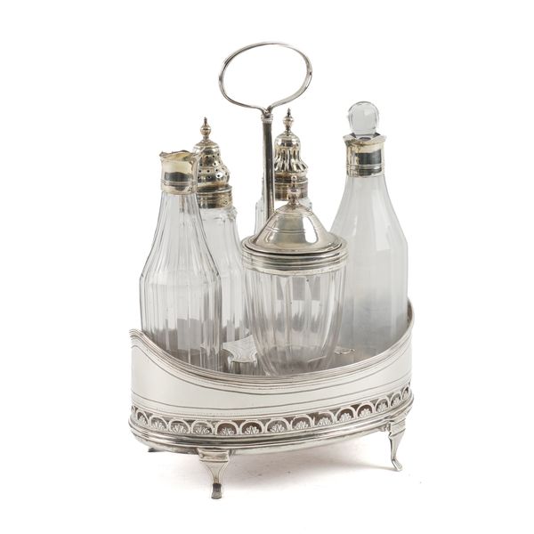 Of boat shaped form, with a loop shaped handle, raised on four feet, probably London 1792, with four associated silver mounted glass fittings, various dates