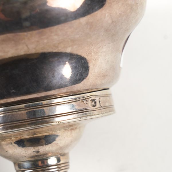 The toddy ladle having a turned wooden handle, the egg shaped bowl London 1732, the wine funnel London 1793, weight of wine funnel 66 grams