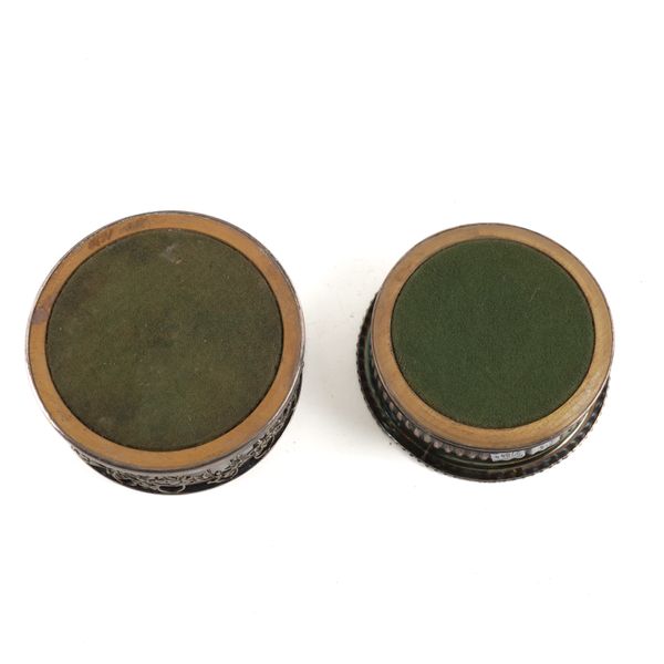 The larger pair pierced with a border of oak leaves and acorns, with a turned wooden base, diameter 14.4cm, the second pair with fluted decoration below a gadrooned rim and with a turned wooden base