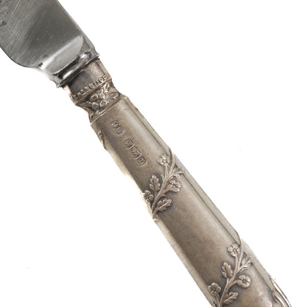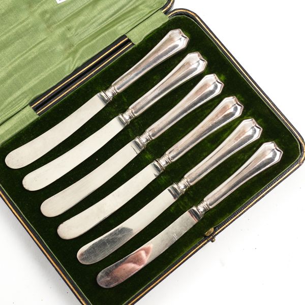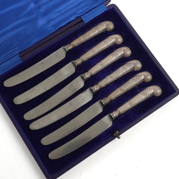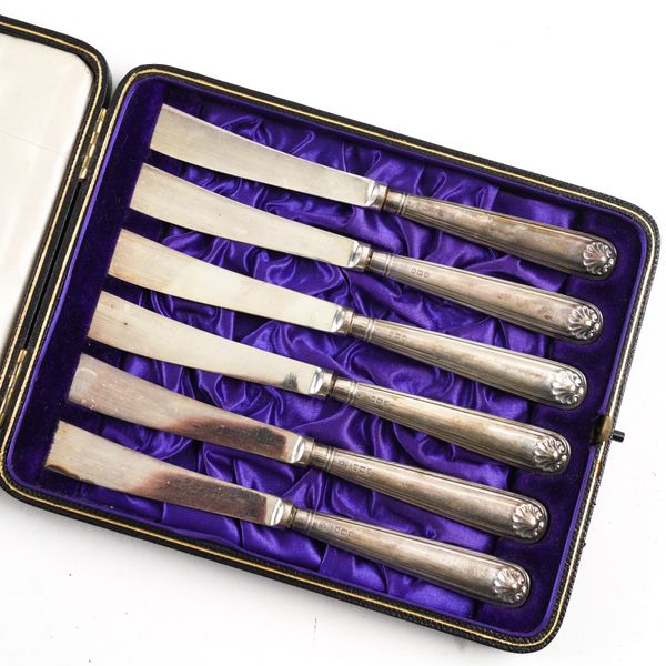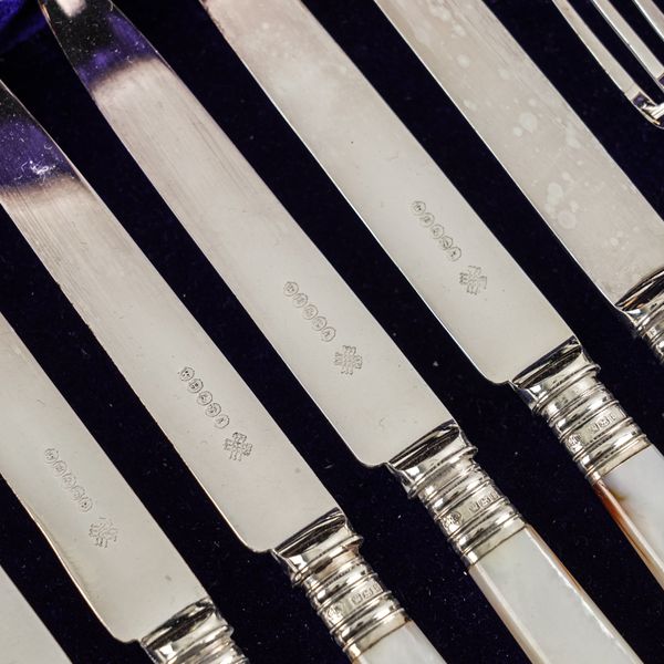 Comprising; twelve pairs of dessert or fruit knives and forks, having mother-of-pearl handles, with an oak case and three set of six tea knives, having loaded silver handles, various dates, with three cases
