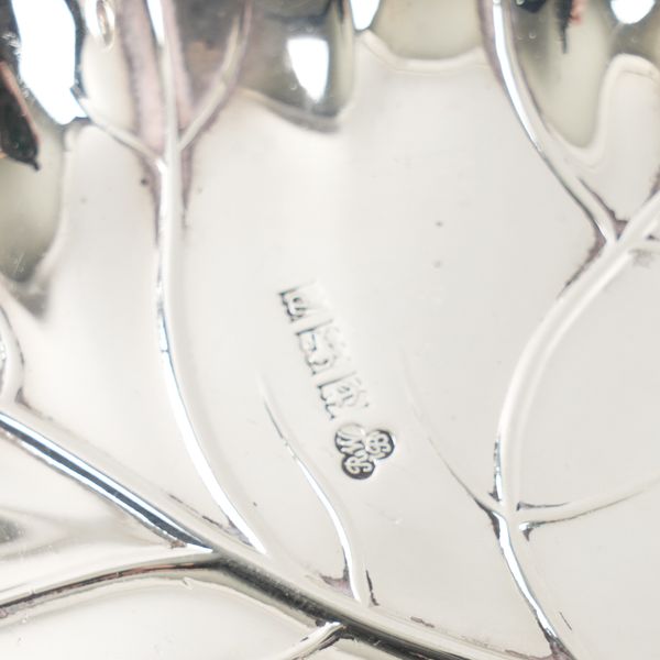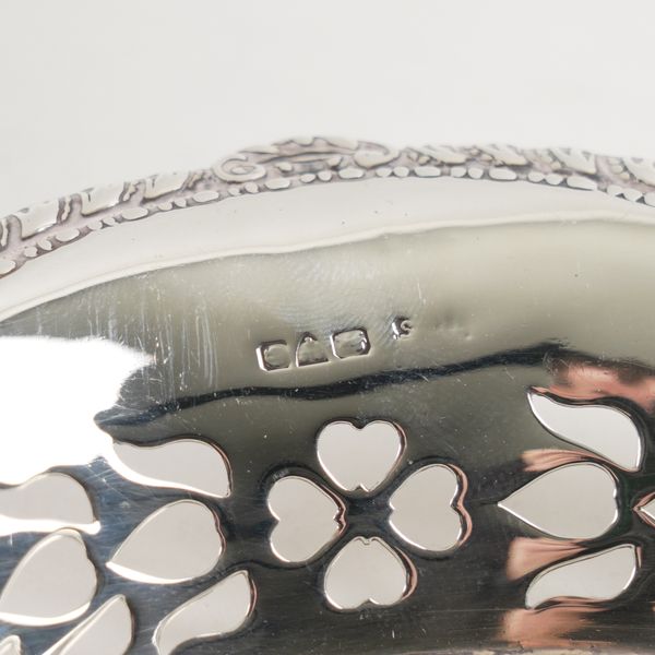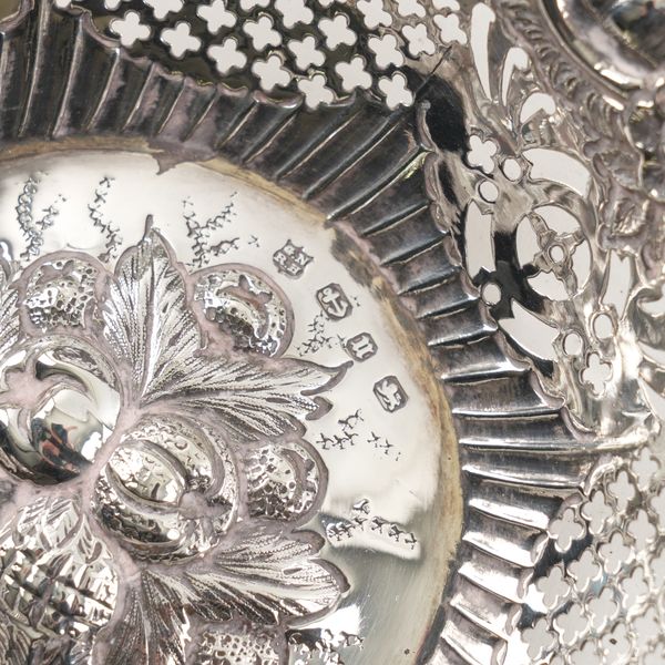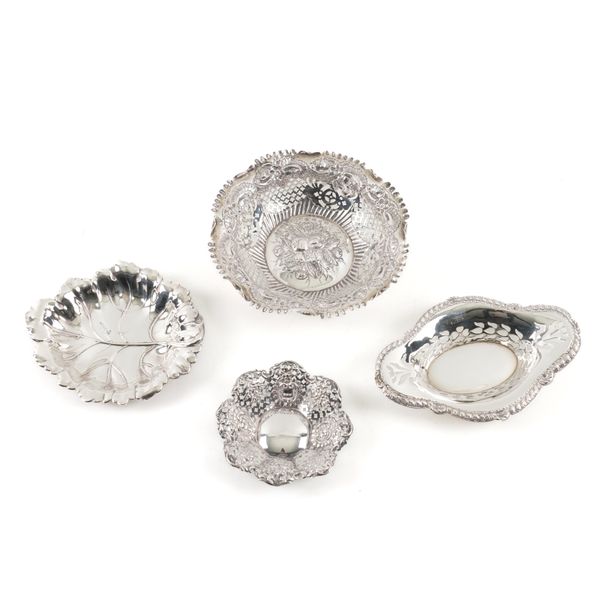 The first embossed and pierced with flowers, leaves and scrolls, diameter 16.5cm, Birmingham 1894, also a dish formed as a leaf, Birmingham 1964 and two further, including Chester 1897 and the last with pierced decoration, length 16.5cm, the hallmark rubbed, combined weight 234 grams