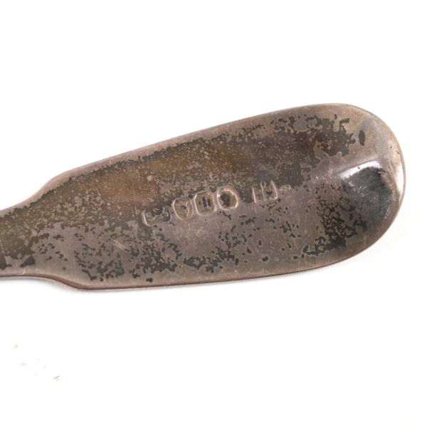 Comprising; a stuffing spoon, London 1804, three dessert spoons, London 1835, another dessert spoon and a butter knife, weight 386 grams