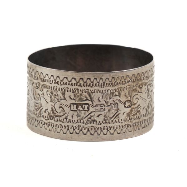 Comprising; a pair with engraved decoration, London 1881, another pair, Birmingham 1896, one with an inscription relating to The Royal Sussex Regiment, hallmark indistinct and two further napkin rings, combined weight 194 grams