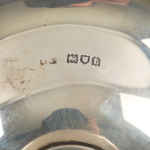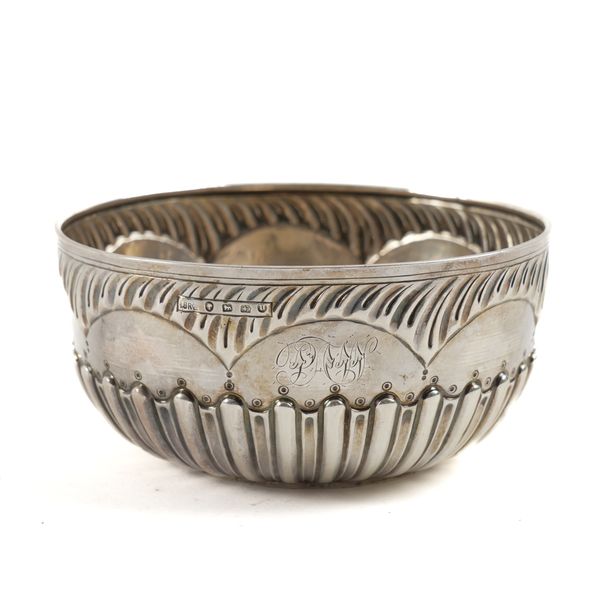 Each bonbon dish raised on a circular foot, diameter 12.6cm, London 1914, the bowl with embossed fluted decoration, monogram engraved, diameter 10.8cm, Birmingham 1887, combined weight 314 grams
