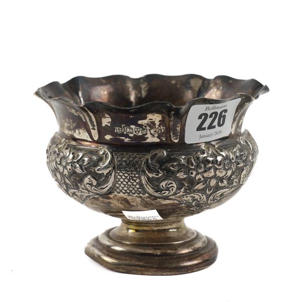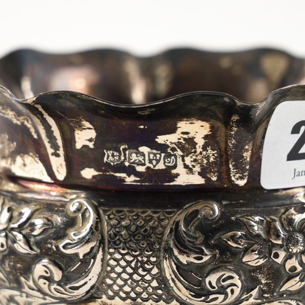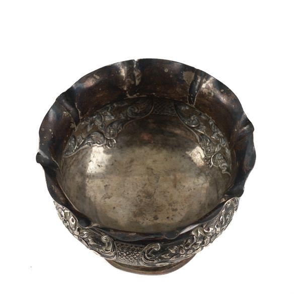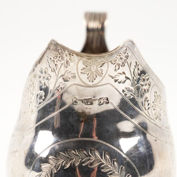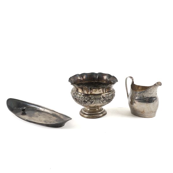 Comprising; a bowl with floral, foliate and scroll embossed decoration, raised on a circular foot, Chester 1904, diameter 12.7cm, a boat shaped candle snuffers tray, London 1797 and a helmet shaped milk jug, with engraved decoration and with vacant oval foliate cartouche, circa 1800 (no town assay or date letter), combined weight 338 grams
