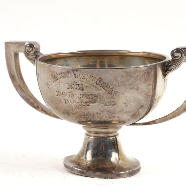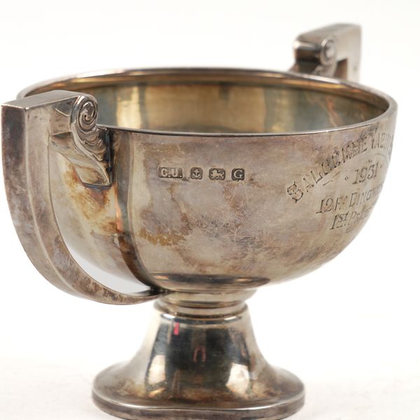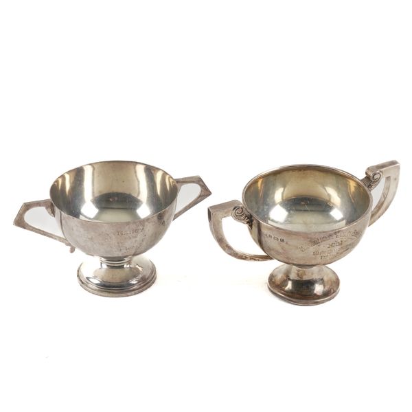 TWO SILVER TWIN HANDLED TROPHY CUPS (2)