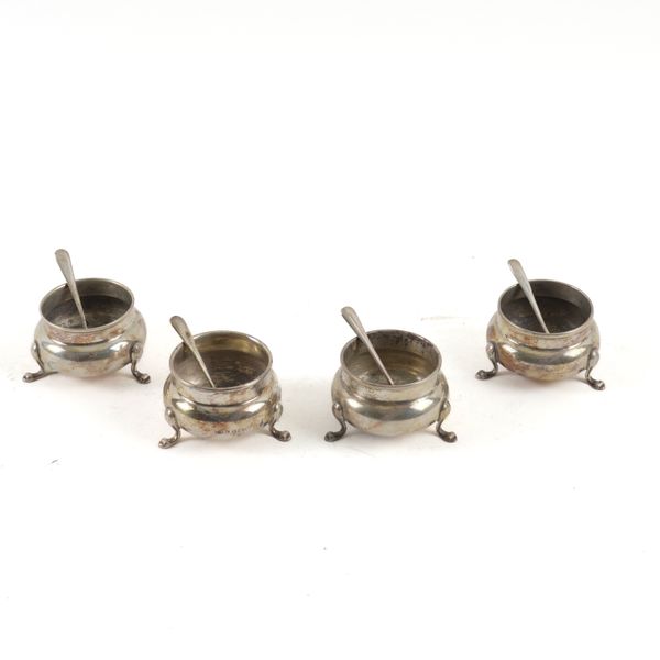 A SET OF FOUR SILVER SALTS AND FOUR ASSOCIATED SILVER SALT SPOONS