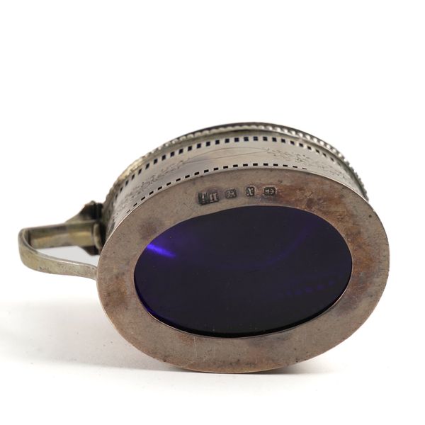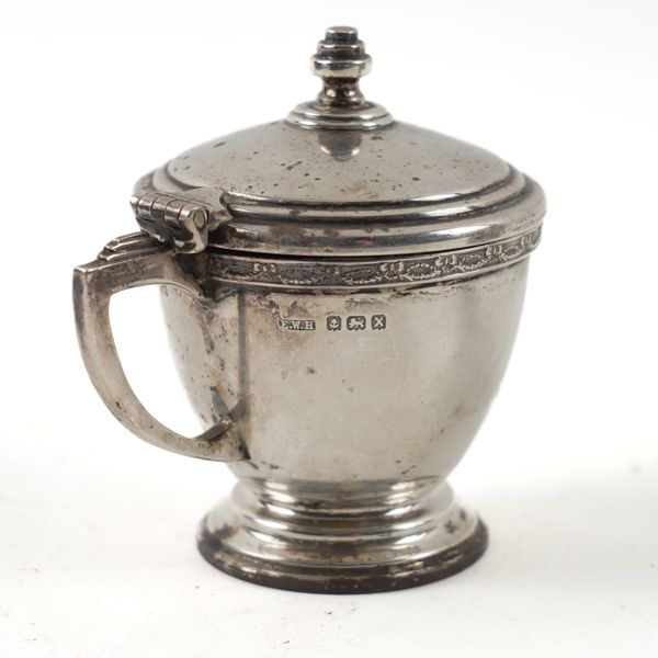 Comprising; four mustard pots, three having blue glass liners and five salt and pepper pots, mixed dates, combined weight 369 grams