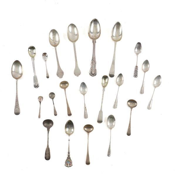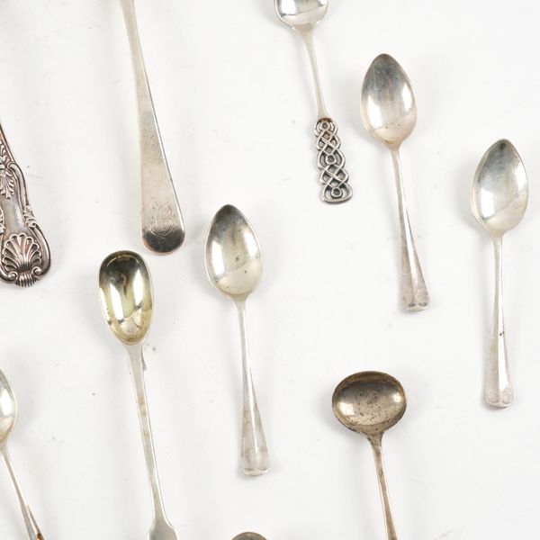 Comprising; two dessert spoons, nine condiment spoons, five coffee spoons and four further spoons, combined weight 345 grams, also a foreign spoon, detailed 830 S