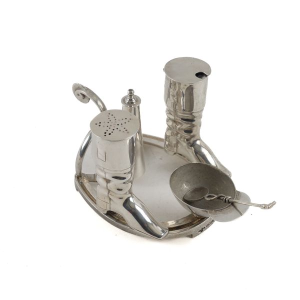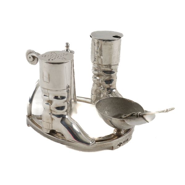 The salt formed from a jockey's cap, the mustard, with a blue glass liner and the pepperette formed from riding boots, also a tabasco sauce container with a silver spoon inside, the silver stand formed as a horseshoe with a spur, Sheffield 1994, combined gross weight including the blue glass liner (as cannot remove) 614 grams and a plated salt spoon, the handle formed as a riding whip