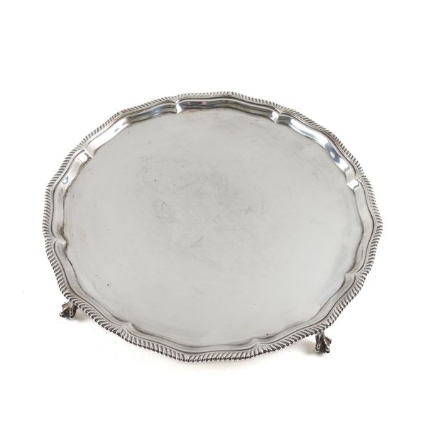 The shaped pie-crust rim having a gadrooned border, raised on four ball and claw feet, diameter 30.8cm, Sheffield 1916, maker Thomas Bradbury & Sons Ltd, weight 874 grams