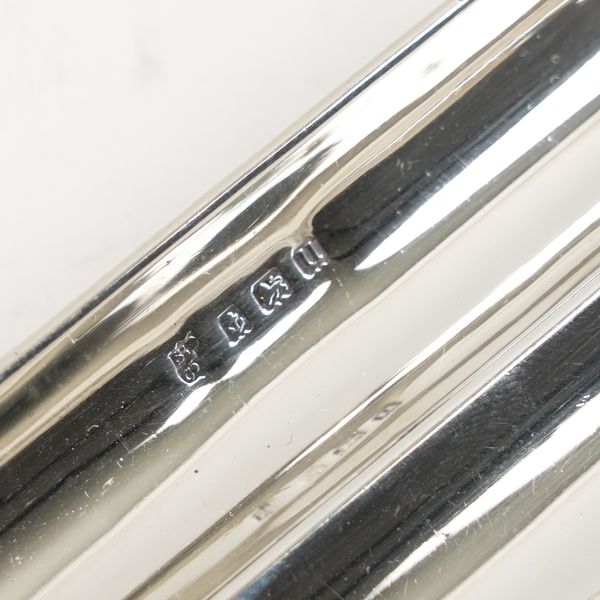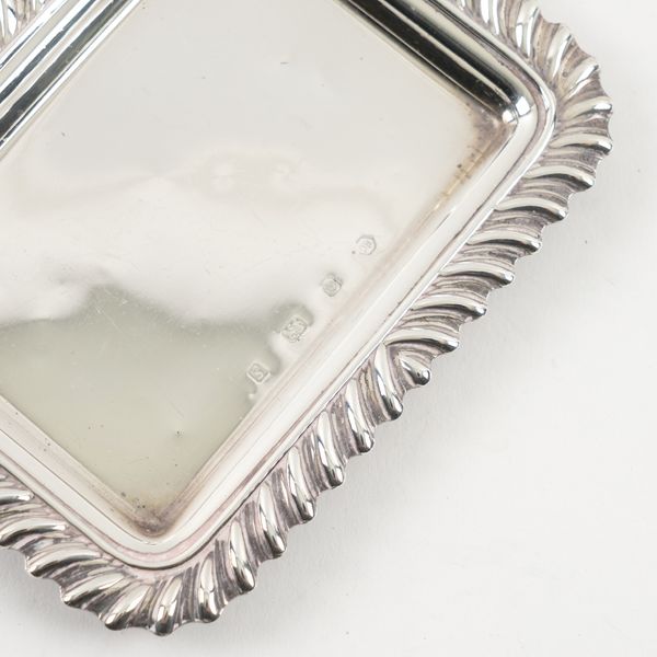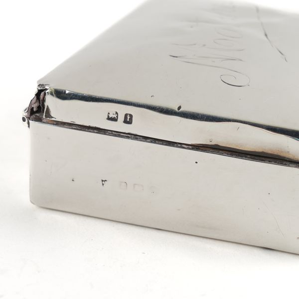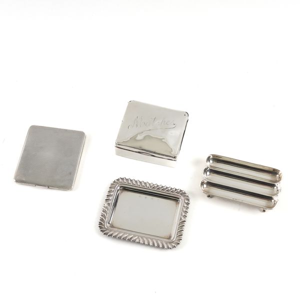 Comprising; a rectangular cigarette case, with engine turned decoration, Birmingham 1936, a triple division rectangular dish, Birmingham 1919, a rectangular trinket dish, decorated with a gadrooned rim, Sheffield 1992, combined gross weight 224 grams and a rectangular matches box, wooden lined within, with a striking plate to the side, probably Birmingham 1908