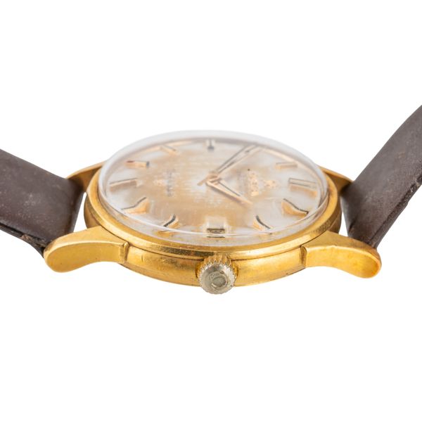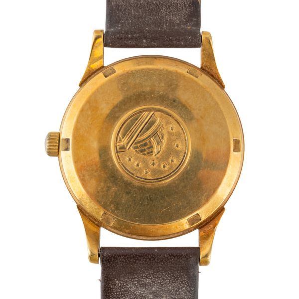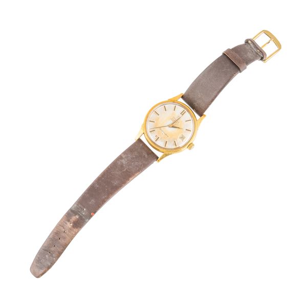 The signed silvered dial with gilt and black baton hour markers, date aperture and with centre seconds, the screw-off caseback with the observatory motif, case diameter 34.4mm, fitted to a leather strap, having a gilt metal buckle