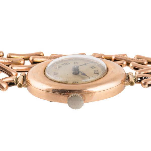 The circular jewelled unsigned lever movement detailed Swiss Made, the unsigned circular silvered dial with black Roman numerals, on a sprung curved bar link bracelet, detailed 9 CT, gross weight 25.1 grams