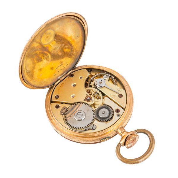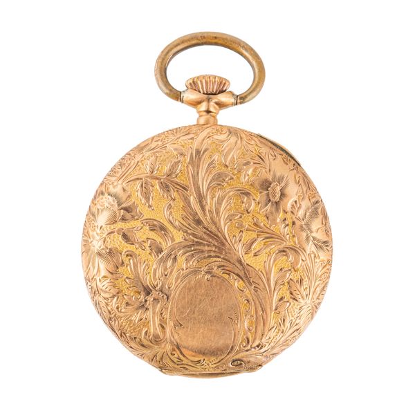 With an unsigned jewelled lever movement, base metal inner case, the unsigned enamelled dial with Roman numerals, the case with engraved decoration, detailed within 14K 0.585, case diameter 46mm, gross weight 72.4 grams