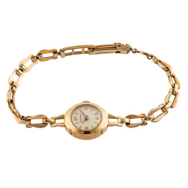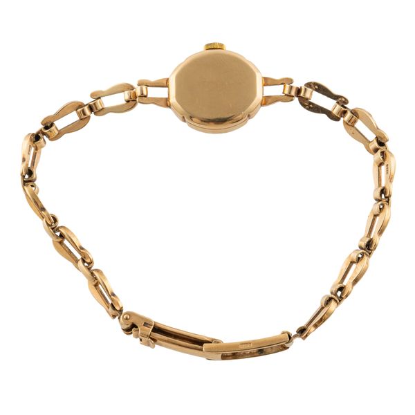 With Arabic and baton hour markers, the case measuring 16.3mm with crown, on a gold bracelet, gross weight 12.2 grams