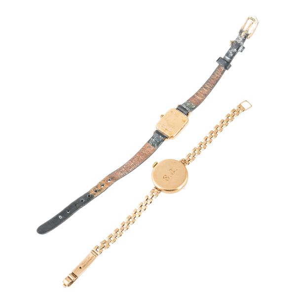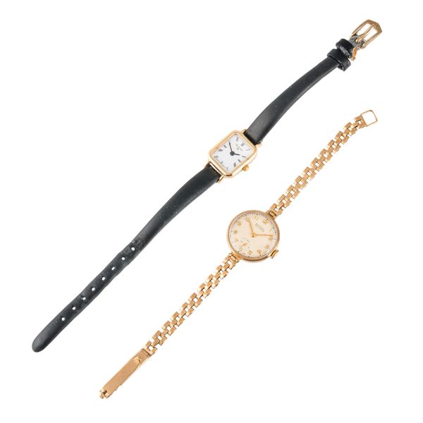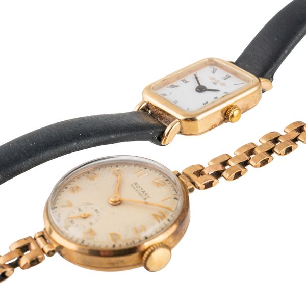 Including a Rotary with Arabic hour markers, the reverse with initials S.J, on a 9ct gold bracelet, gross weight 15.3 grams, and a WHW watch with Roman numeral hour markers, with a 9ct rectangular case and leather strap, gross weight 9.5 grams