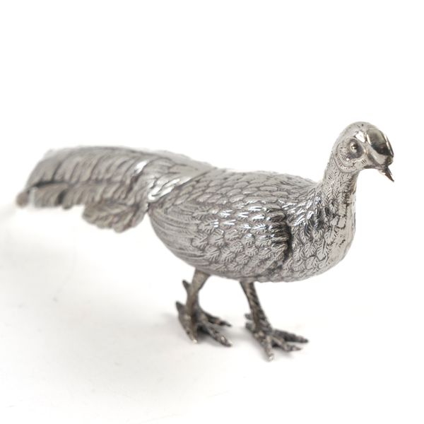 Comprising; a pair of sugar tongs, a preserve spoon, two similar small vases, three condiments, a button hook, also a foreign model of a pheasant and an oval pill box, the hinged lid mounted with a lapis lazuli panel, import mark Sheffield 1994, combined weight of weighable silver 129 grams
