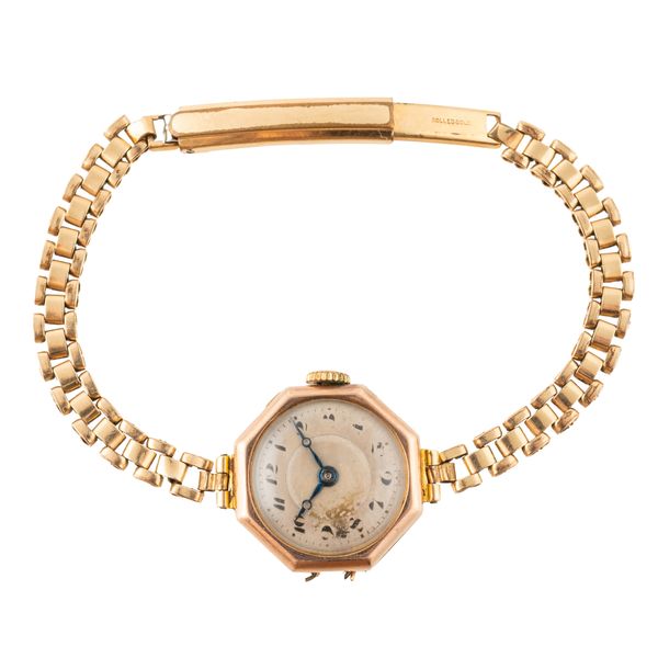 Featuring a hand-wound movement in a yellow metal case stamped '375' and measuring 22mm with an off white dial, all on an integrated 9ct gold link bracelet. Total weight of item: 16.6 grams