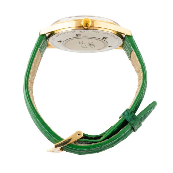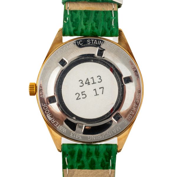 Reference: 3413 Calibre: Hand-wound FHF ST 969-4N Complication: Date Dial: White Glass: Acrylic Markers: Baton Bezel: N/A Case material: Steel/Gilt Case size: 37mm Bracelet: Green leather Clasp: Pin Buckle Box: No Papers: No Additions: