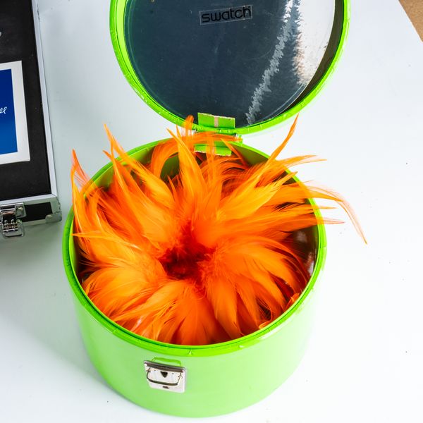 A Pop Swatch watch with orange feathers. Possible model PMZ105 (1)