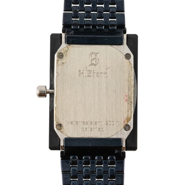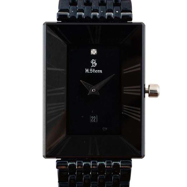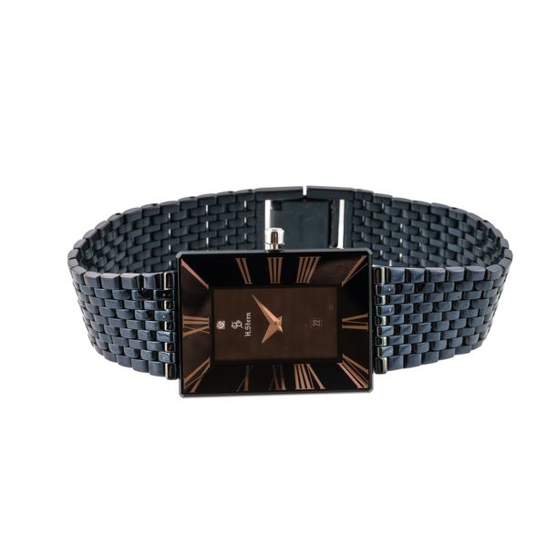 Featuring a quartz movement in a steel case measuring 25mm wide with a black dial set with a single diamond and dark blue bezel, all on an integrated articulated bracelet with a folding clasp and buckle.