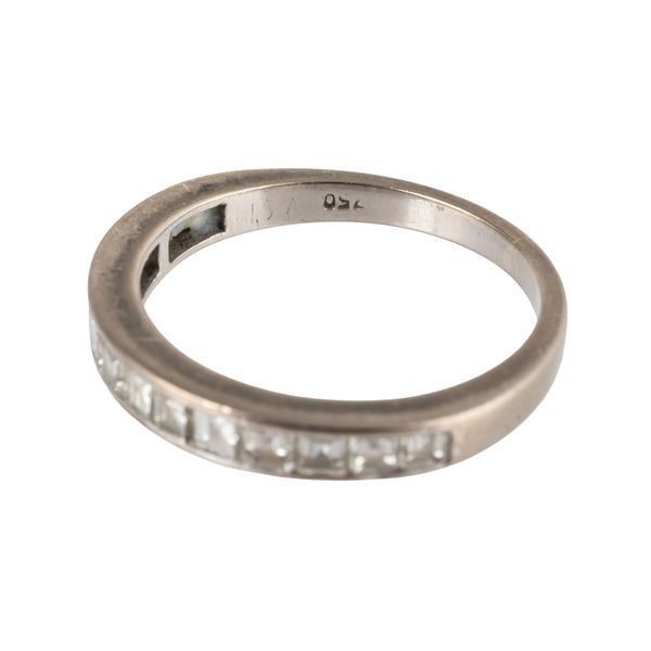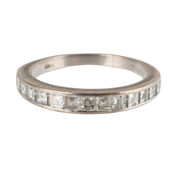 Channel set with square step cut diamonds, in 18ct white gold, size O½, gross weight 3.4 grams