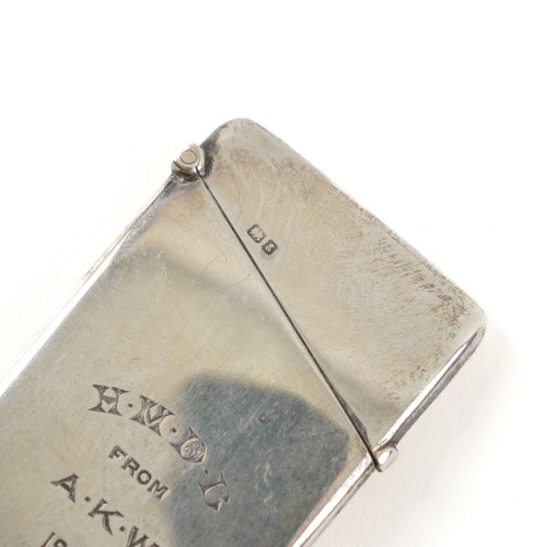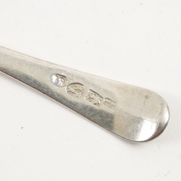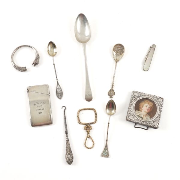 Comprising; the card case Chester 1905, a Newcastle dessert spoon, circa 1784, combined weight 63 grams, three foreign spoons, a square photograph frame, Birmingham 1903, width of frame 6cm, a mother-of-pearl folding fruit knife, Sheffield 1924, a gilt metal spy glass, a button hook and a bangle, probably Asian