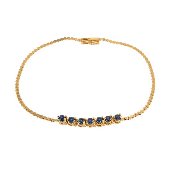 In 14ct gold, the centre set with seven round cut sapphires, measuring 18.5cm in length, with box clasp and safety clip, gross weight 3.2 grams