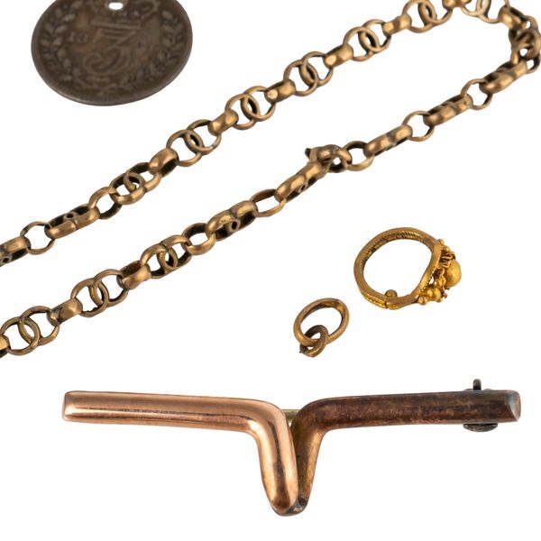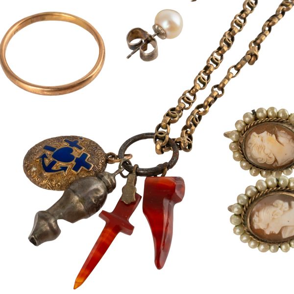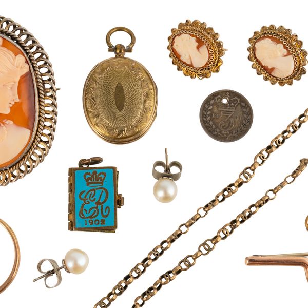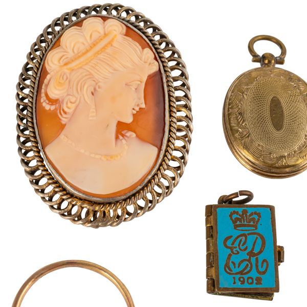 Including a gold wedding band with indistinguishable marks, a gold bar brooch with indistinguishable marks, combined weight 5.4 grams, a cameo, a pair of cameo earrings, a pearl bar brooch, two pairs of pearl earrings, a book style locket, and other items