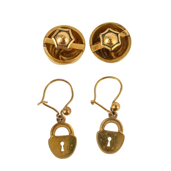 One pair of domed form in unmarked gold with rolled gold butterflies, the other padlock motif drops, the hook fittings marked for 9ct gold, gross weight 4.9 grams