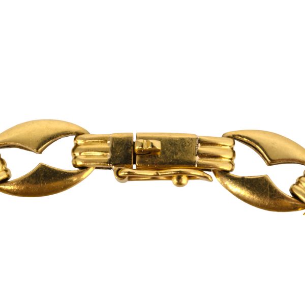 In gold with indistinguishable marks, measuring 19cm in length, with box clasp and safety clip, weight 25.5 grams