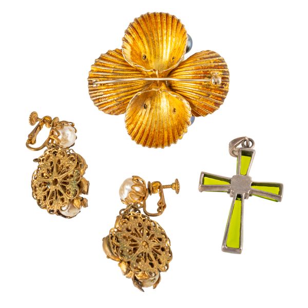 Including a pair of paste and faux pearl screw back earrings, a green paste and silver cross and a silver gilt shell brooch set with pearls