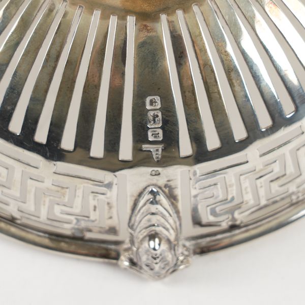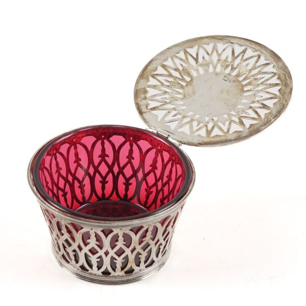 The bonbon dish with pierced decoration, raised on a circular foot, diameter 13.7cm, the pot pourri box of circular hinge lidded form, having pierced decoration, by William Comyns, London 1898, combined weight 261 grams, with a cranberry coloured glass liner