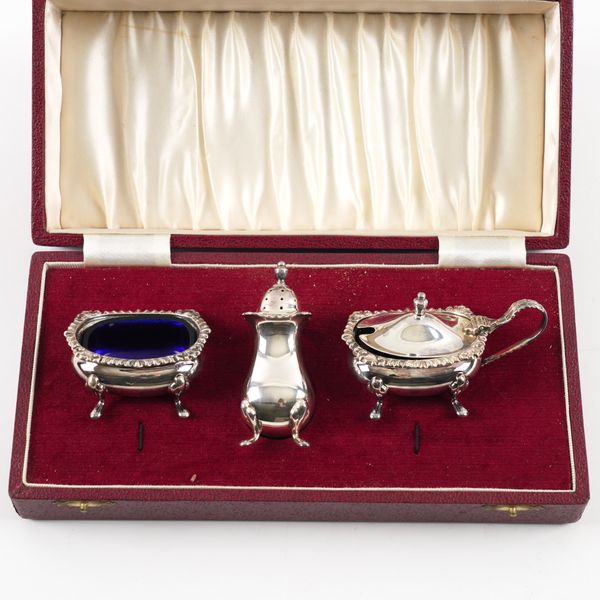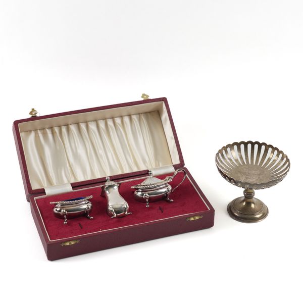 A SILVER THREE PIECE CONDIMENT SET AND A SILVER PEDESTAL BONBON DISH (2)