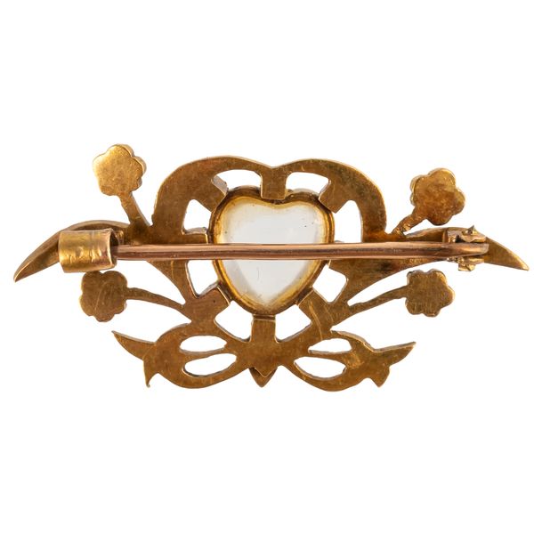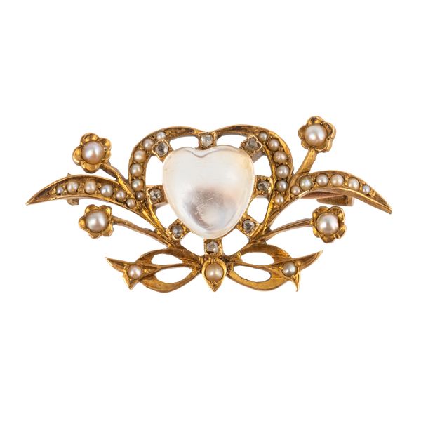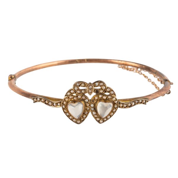 The brooch with central heart shaped moonstone, seed pearls and diamonds, in unmarked gold, the bangle with two heart shaped moonstones and seed pearls, in 9ct gold, inside diameter 57.6mm x 46.7mm, with a safety chain, combined gross weight 10.3 grams