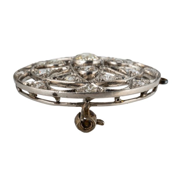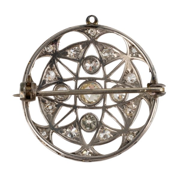 Of circular form, mounted with old cut diamonds, in unmarked white metal, measuring 3cm in diameter, gross weight 7.5 grams
