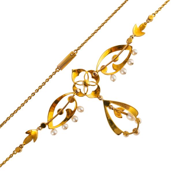 With a floral and foliate motif integrated pendant, on a fine link chain with barrel clasp marked 15ct, measuring approximately 28cm in length gross weight 8.2 grams, with a fitted box