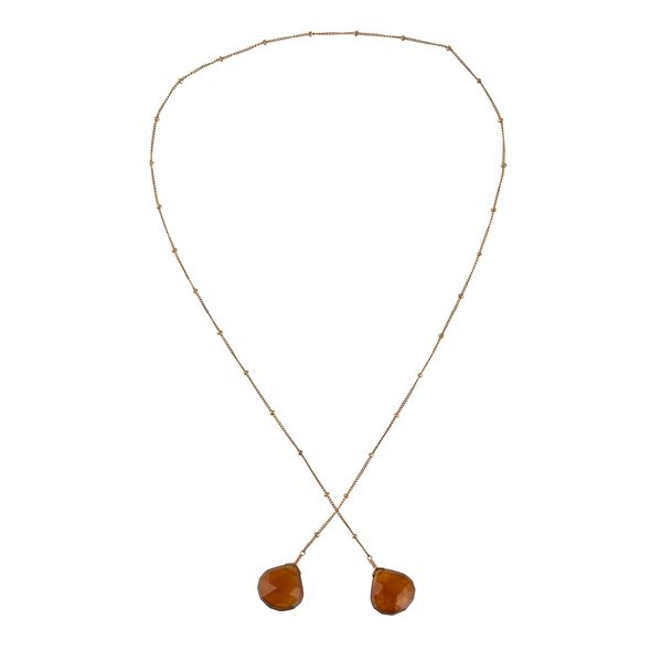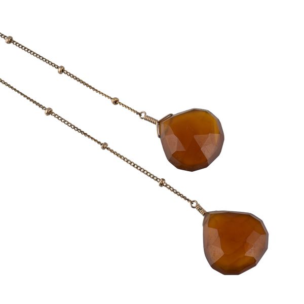The front with two faceted cornelian pendant drops, on a gold curb link chain with beads at intervals, length 51cm, gross weight 5.5 grams