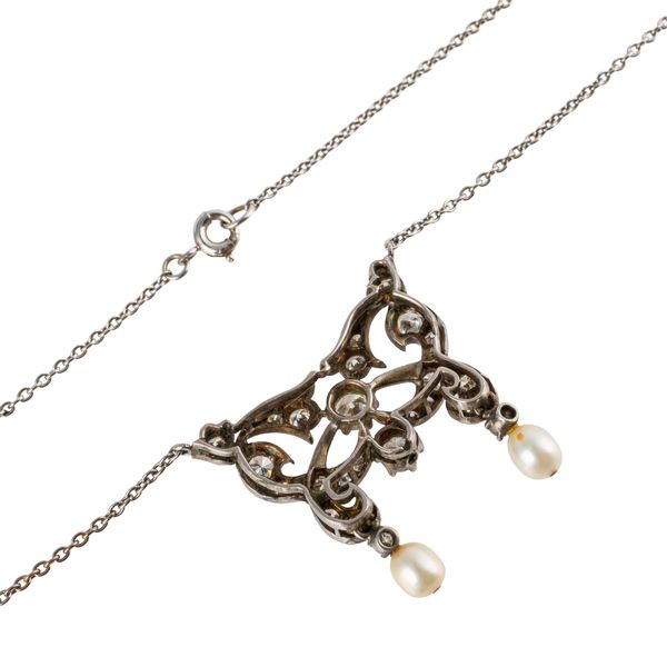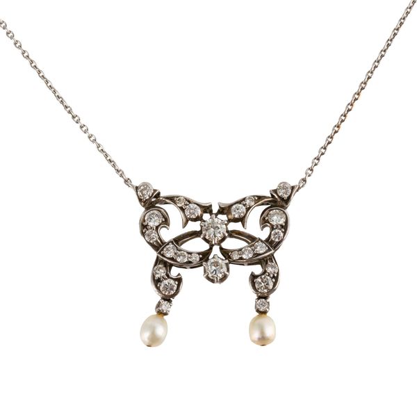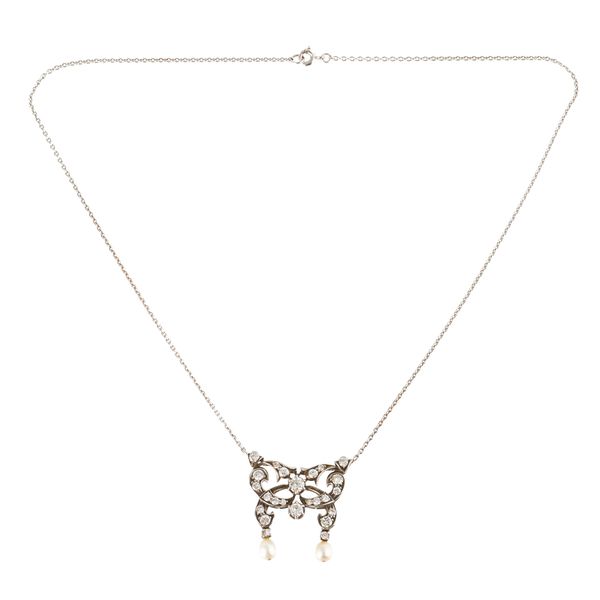 Mounted with round brilliant cut diamonds and two pearls, in unmarked white metal testing as white gold, measuring approximately 45cm in length, gross weight 6 grams