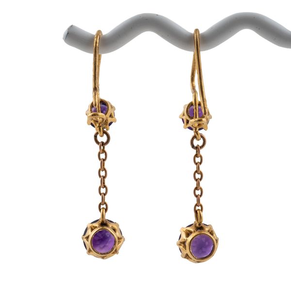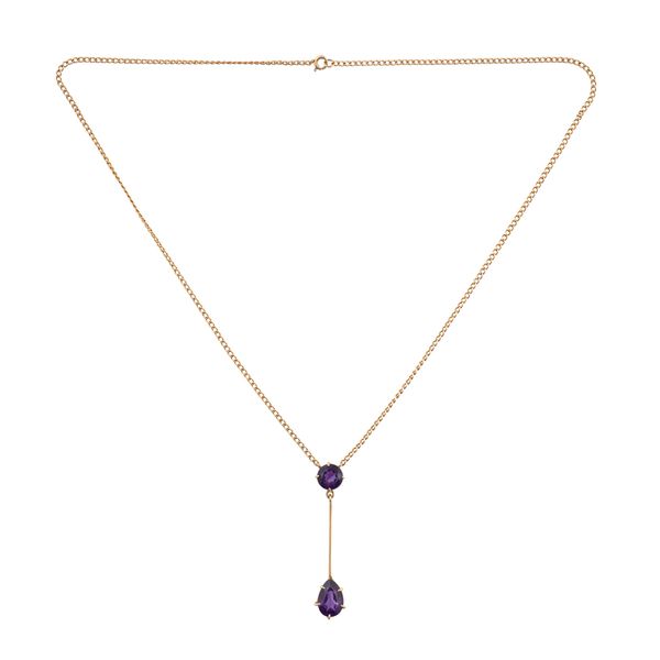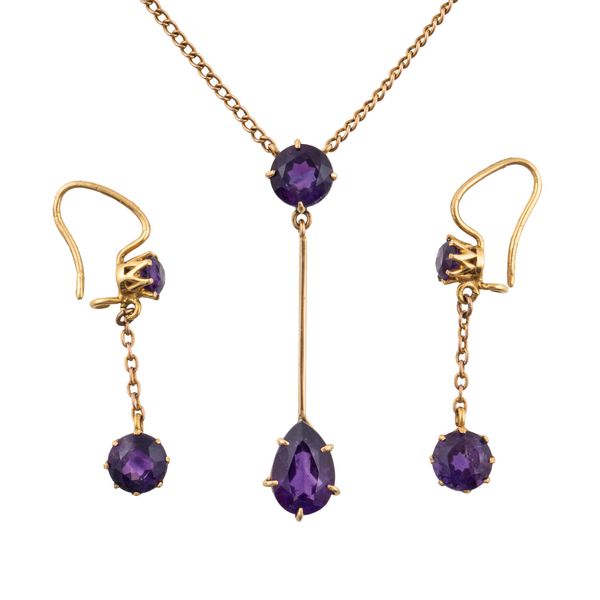 The earrings with a round cut amethyst suspended from a section of chain, with hook fittings, in unmarked gold, the necklace with pear cut amethyst suspended from a bar and further round cut amethyst, integrated onto a curb link chain marked for 9ct, measuring approximately 45cm in length, gross weight 7.4 grams
