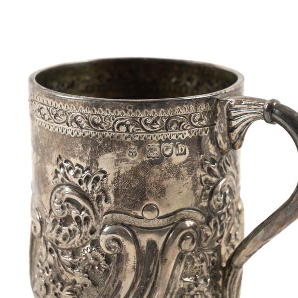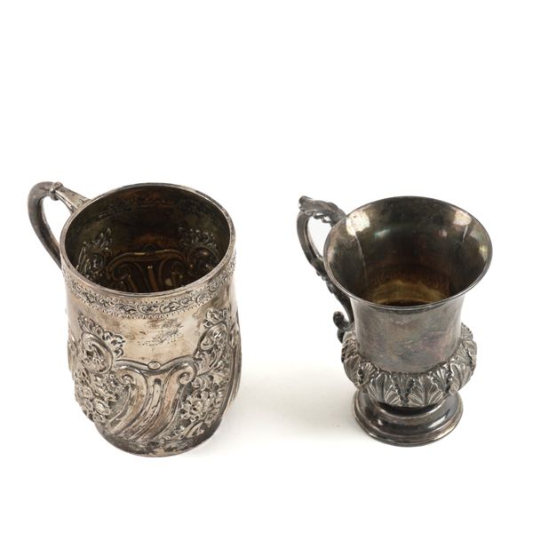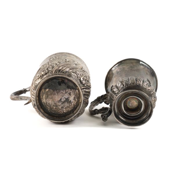 Comprising; the larger with floral, foliate, scroll and spiral fluted embossed decoration, engraved Jany 10th 1899, maker Josiah Williams & Co (George Maudsley Jackson & David Landsborough Fullerton), London 1897, height 9cm, the smaller campana shaped, decorated with a foliate band and with a scrolling handle, raised on a circular foot, by George Unite, Birmingham 1856, height 8.3cm, combined weight 216 grams
